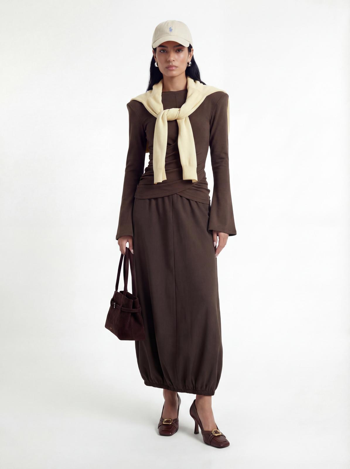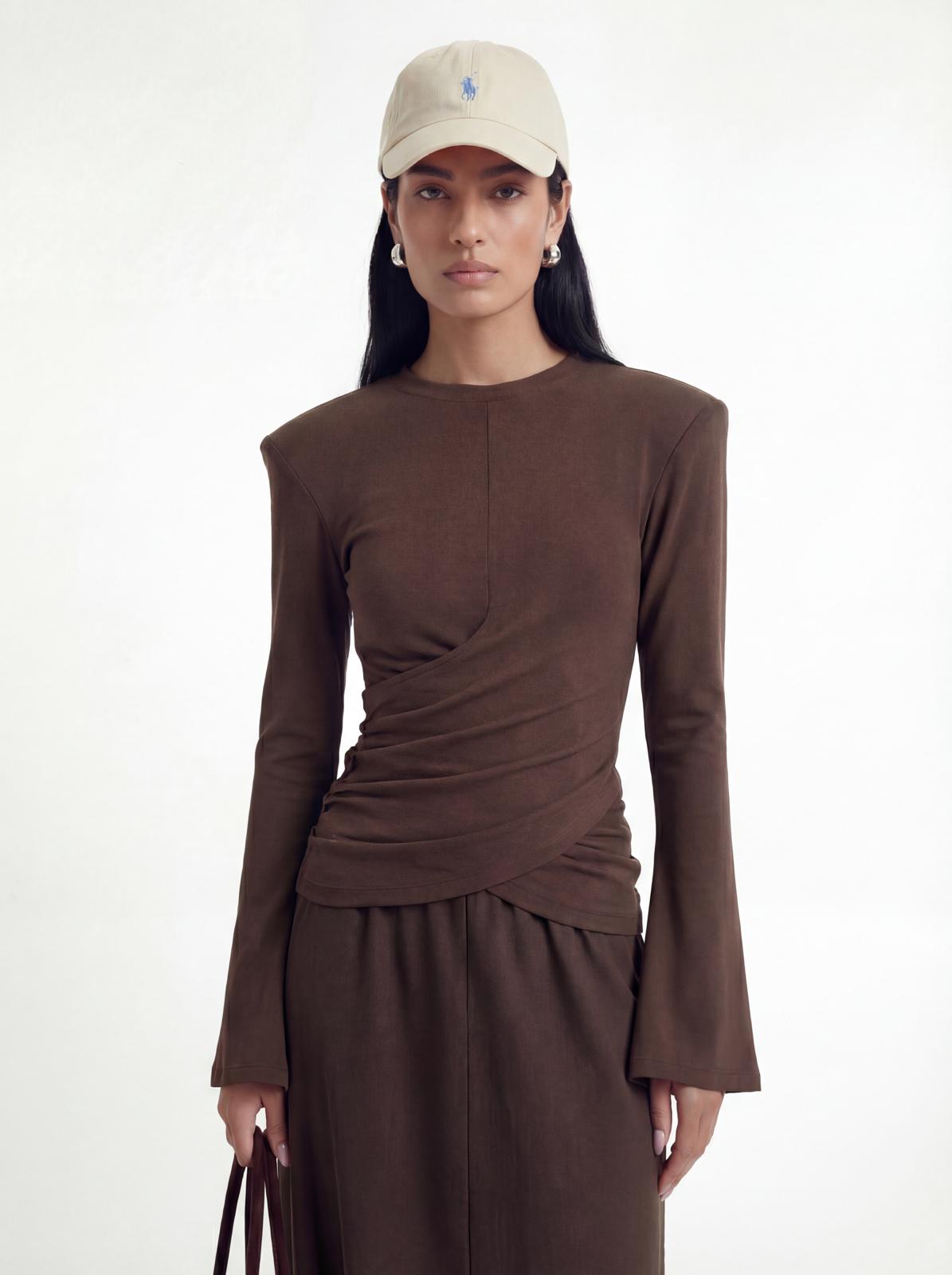 חולצה ארוכה עם איקס וכריות בכתפיים מידת הבגד על הדוגמנית XS.