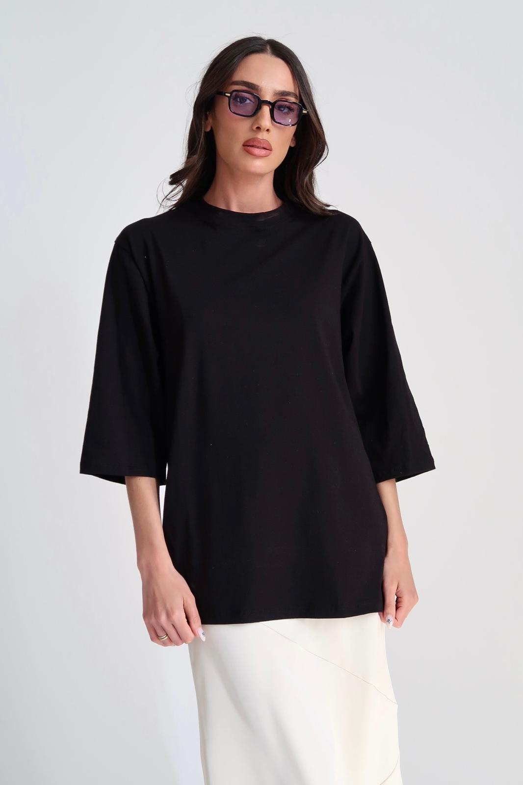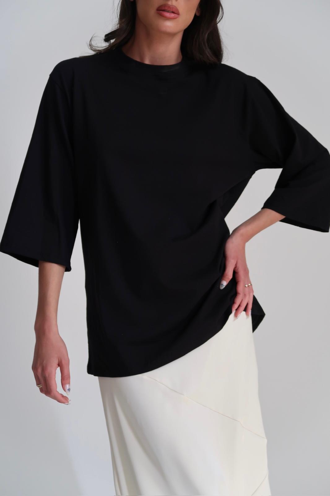 טי שרט ארוכה בגזרה א-סימטרית עם צווארון סירה ושרוול ארוך מתרחב. מידת הבגד על הדוגמנית 0.