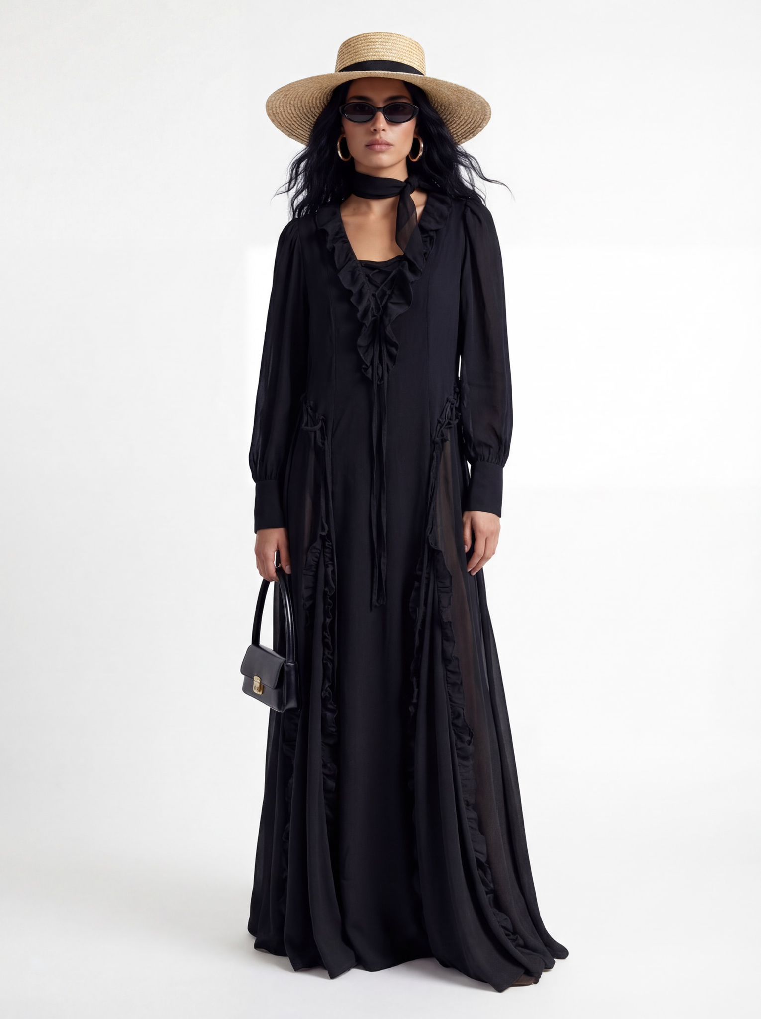 שמלת מקסי מבד שיפון קליל ונעים, בהדפס פרחוני בגוונים חמים. גזרת A רכה עם כיווצים, שרוולים תפוחים ובנוסף חגורת קשירה נפרדת. מידת הבגד על הדוגמנית XS.