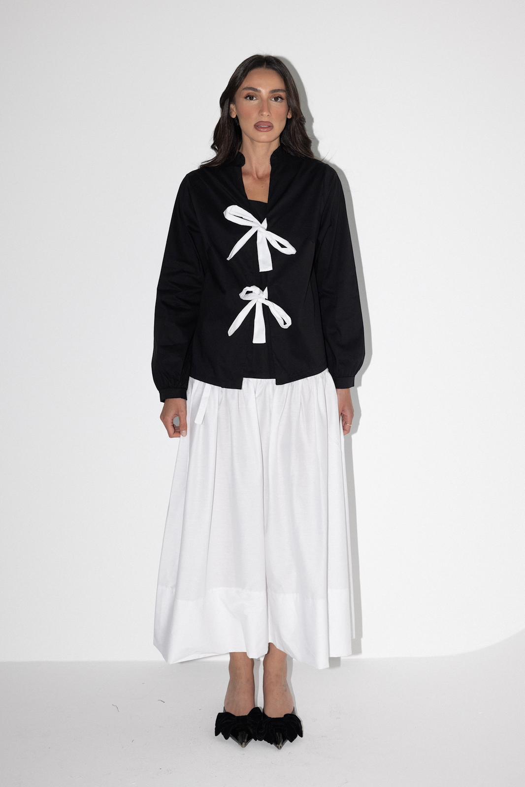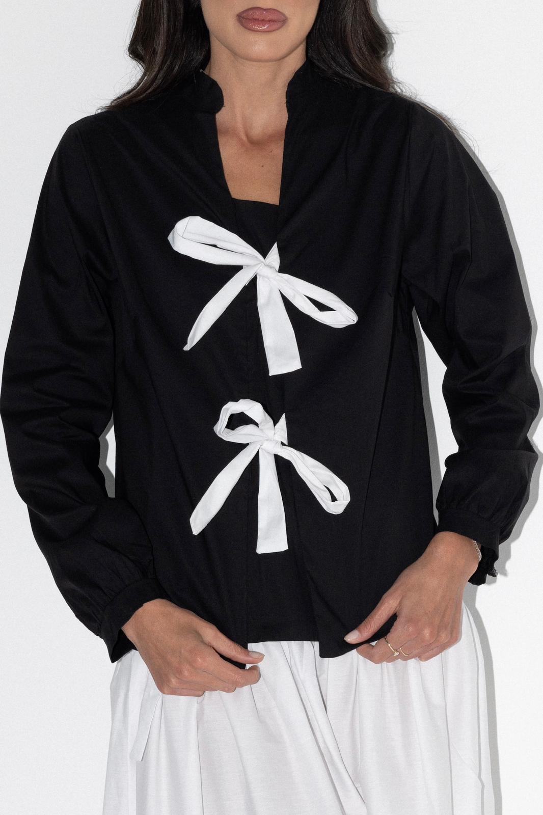 חולצה בגזרה ישרה עם קשירות פפיון מקדימה. מידת הבגד על הדוגמנית 0.