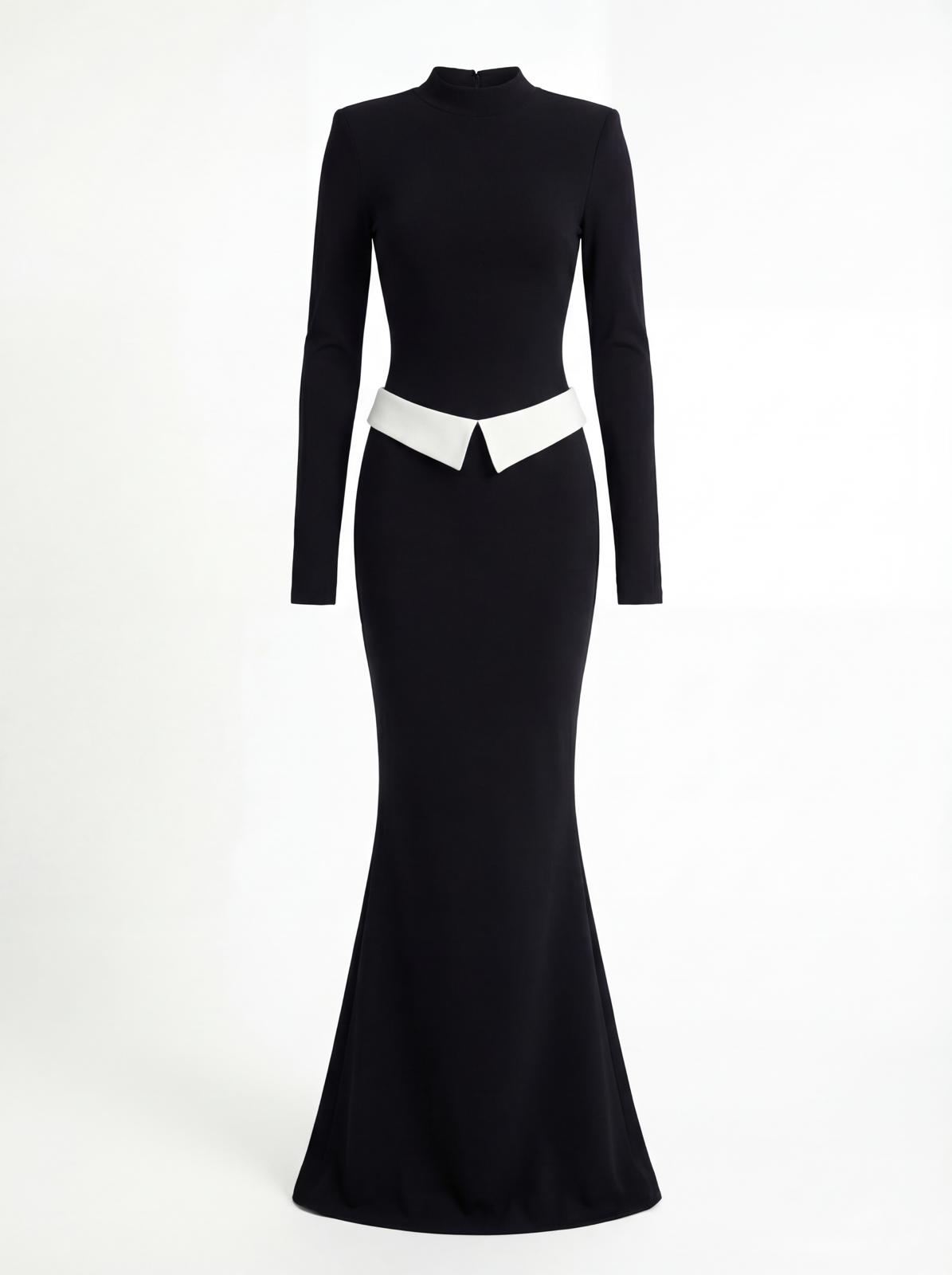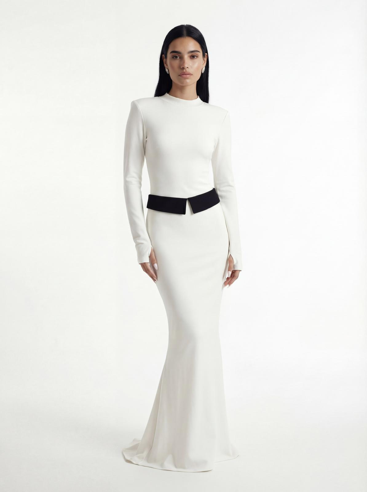 חליפת שני חלקים, בגד גוף מבד מחטב בגזרה צמודה עם גולף, שרוולים ארוכים וכפפה ביד וחצאית עם קיפול לבן באורך מקסי. מידת הבגד על הדוגמנית XS