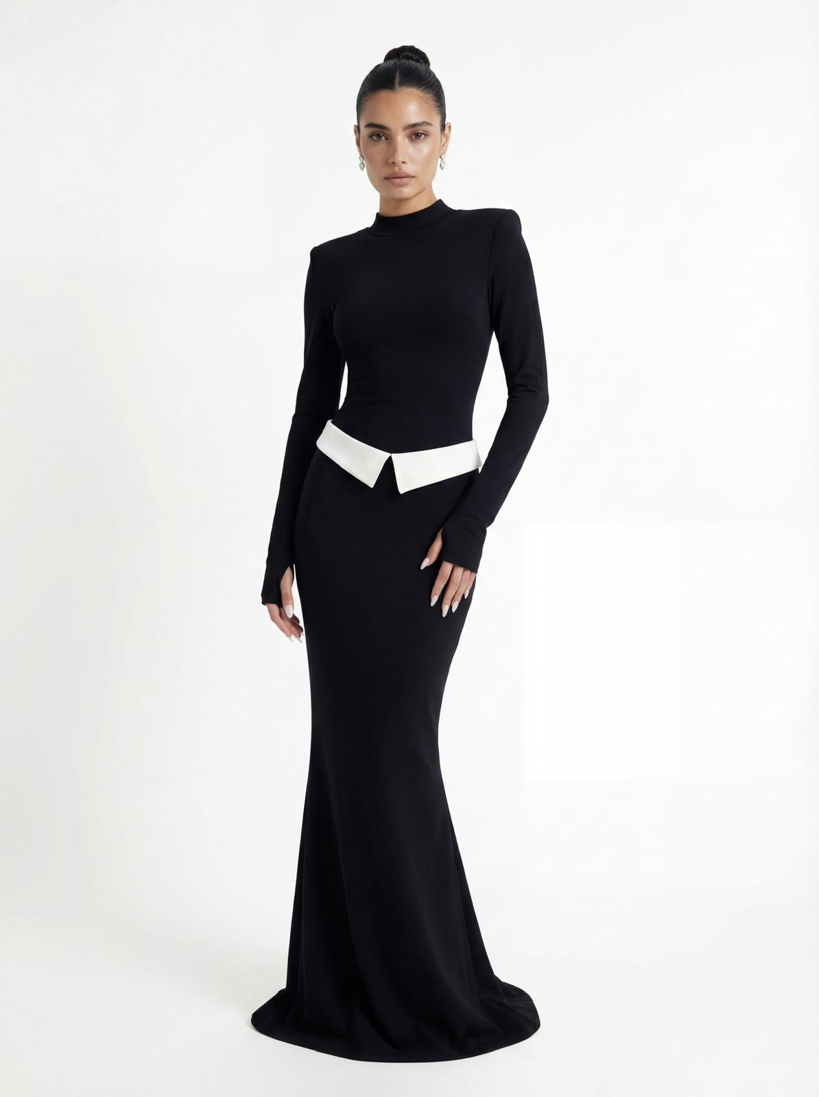 חליפת שני חלקים, בגד גוף מבד מחטב בגזרה צמודה עם גולף, שרוולים ארוכים וכפפה ביד וחצאית עם קיפול לבן באורך מקסי.