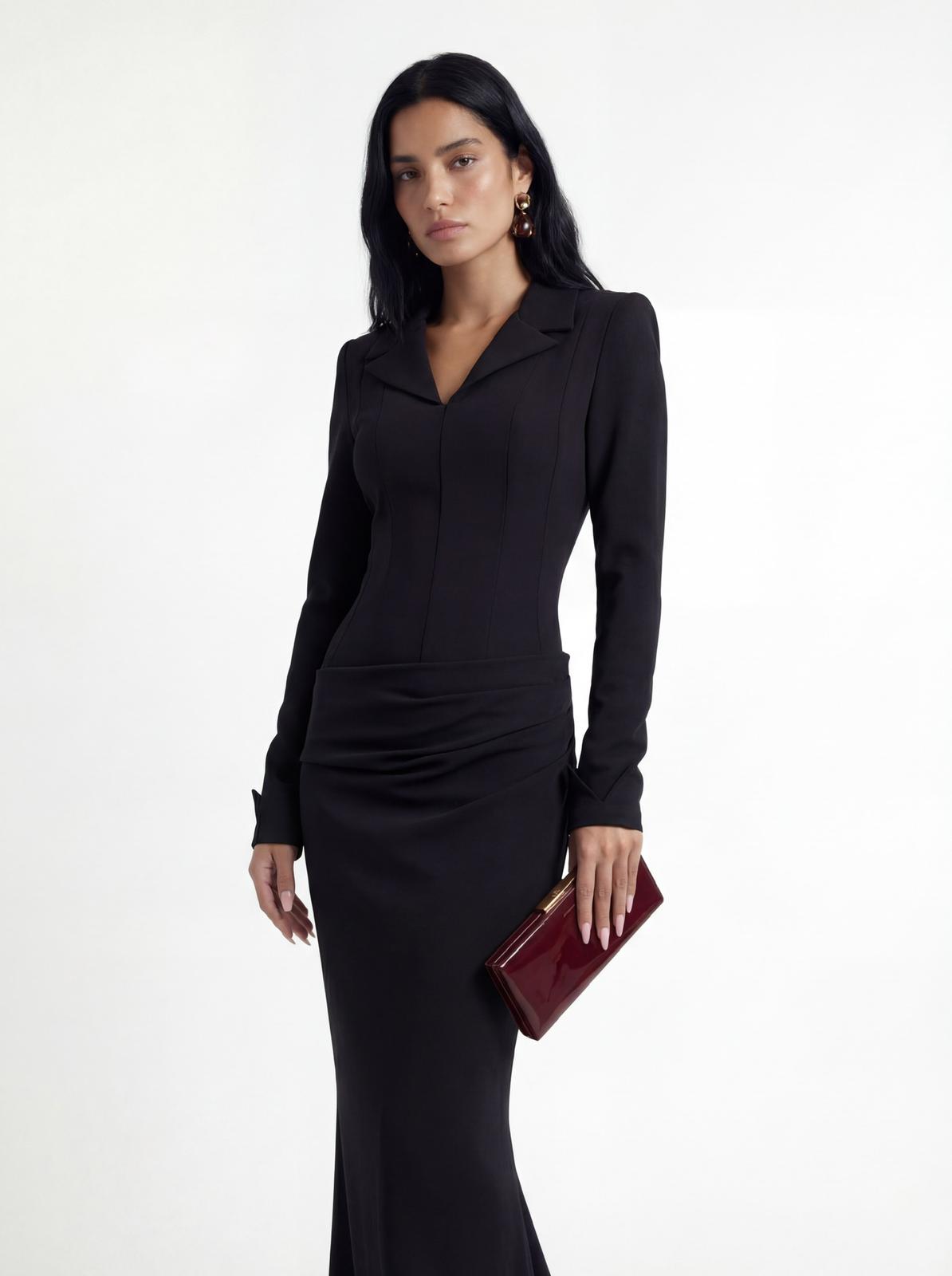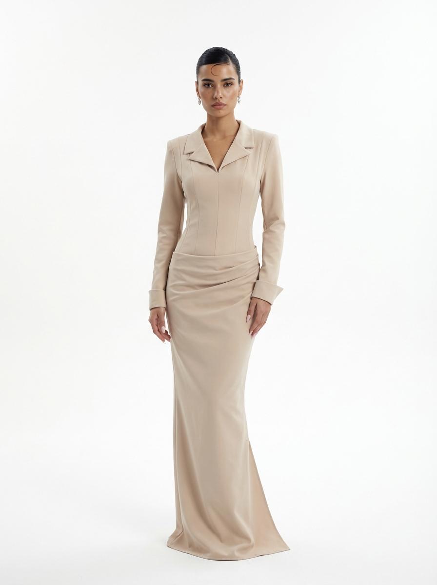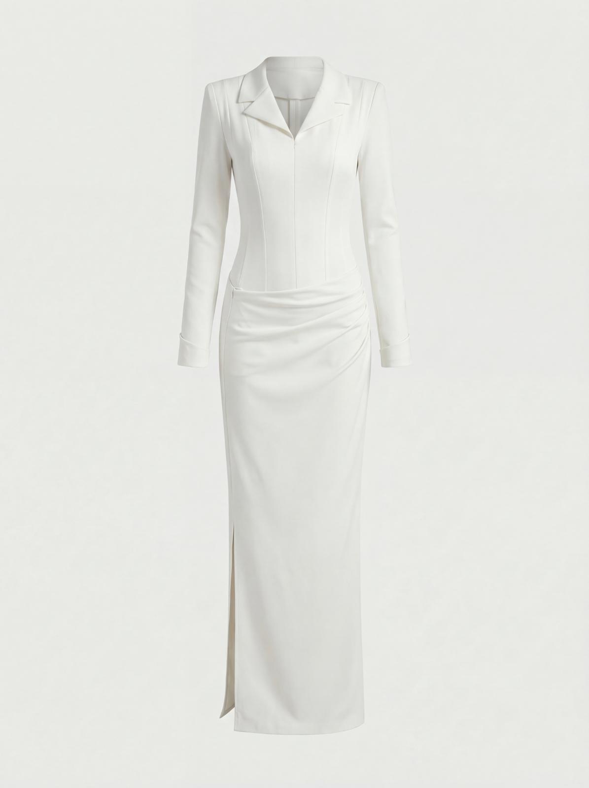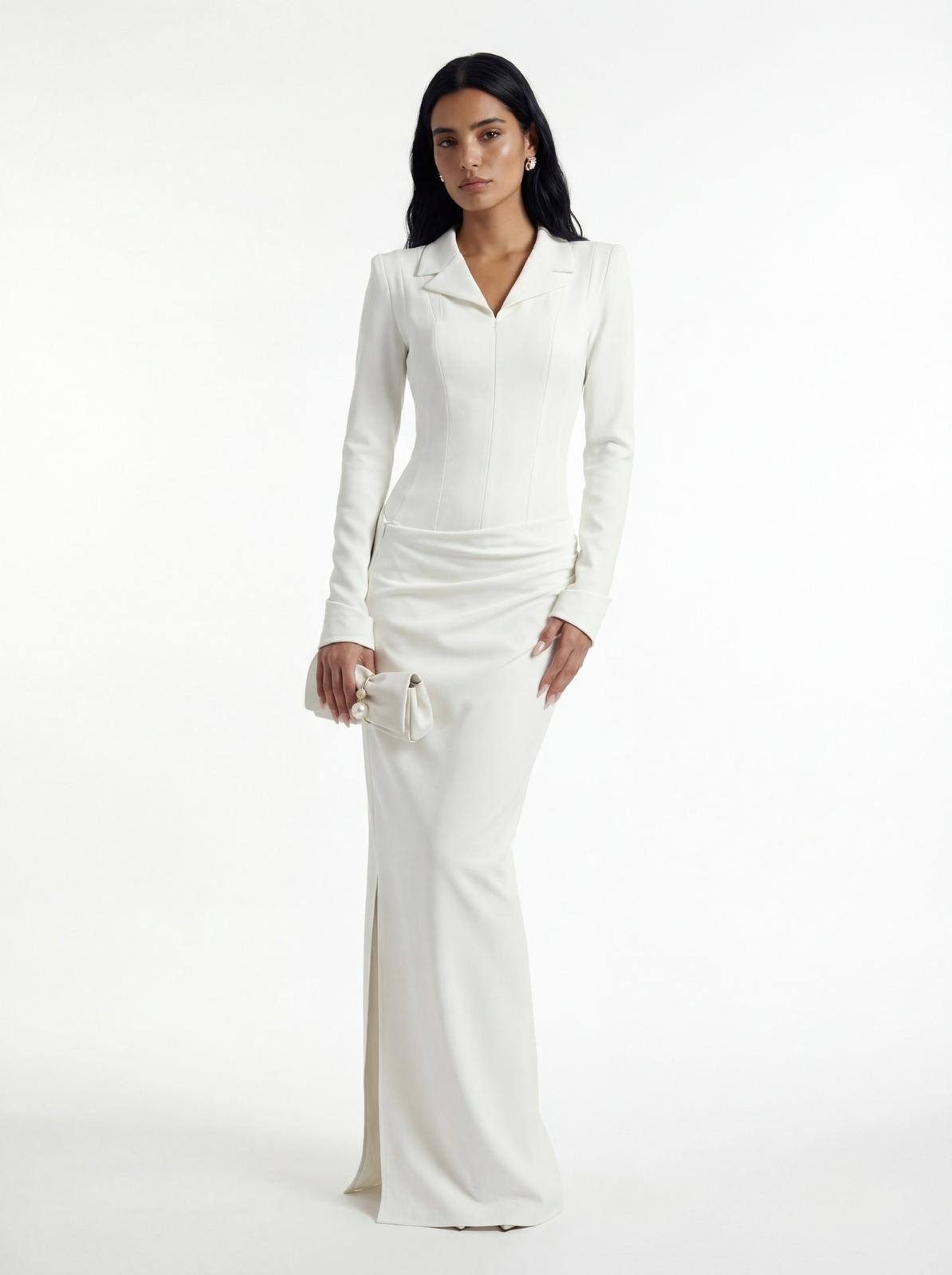 חליפת שני חלקים, בגד גוף מבד מחטב בגזרה צמודה עם גולף, שרוולים ארוכים וכפפה ביד וחצאית עם קיפול לבן באורך מקסי.