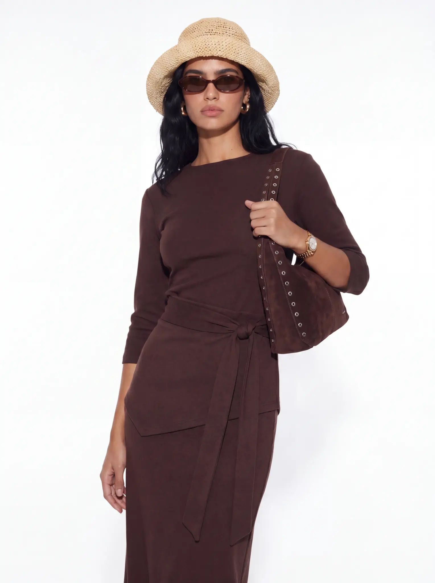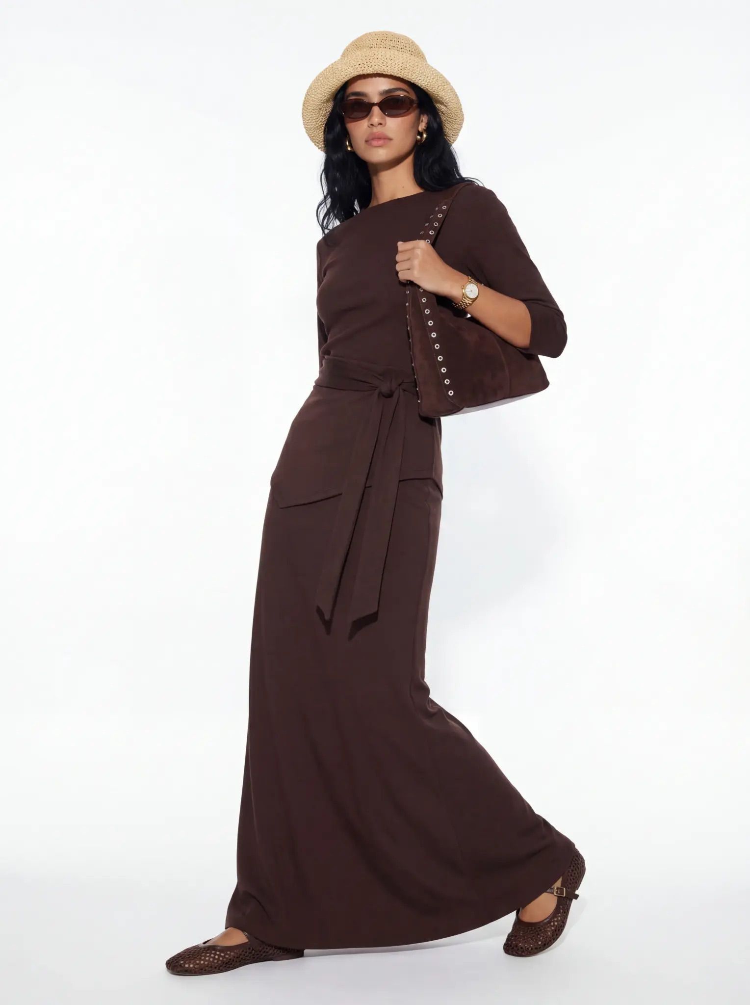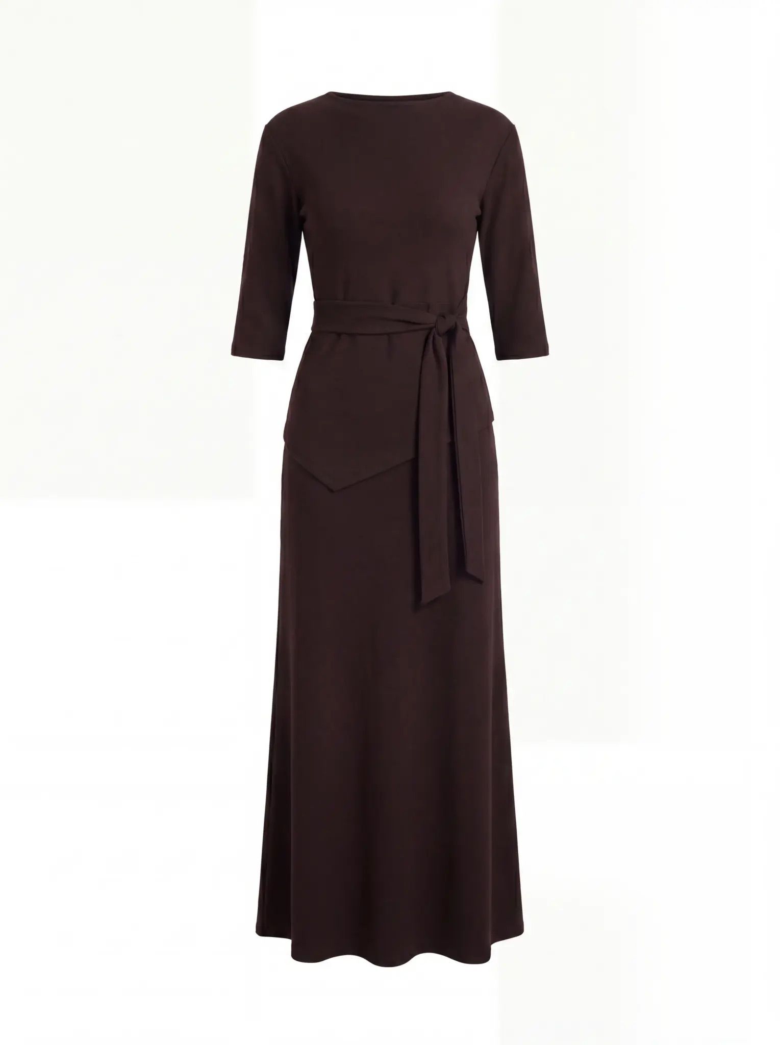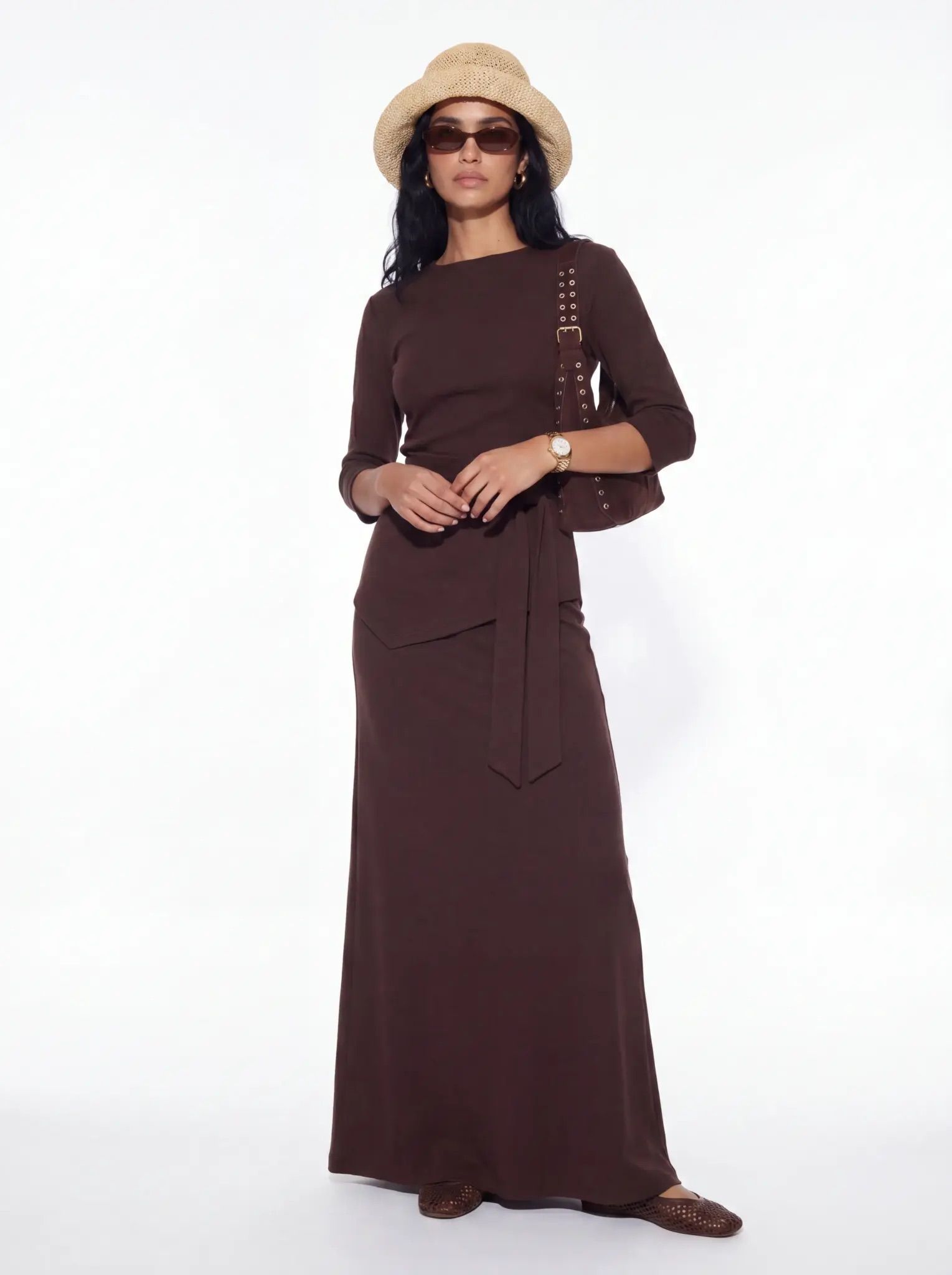 חליפת שני חלקים חולצה עם שרוולי 3/4 וחצאית מקסי תואמת, עם חגורת קשירה במותן למראה אלגנטי. מידת הבגד על הדוגמנית XS.