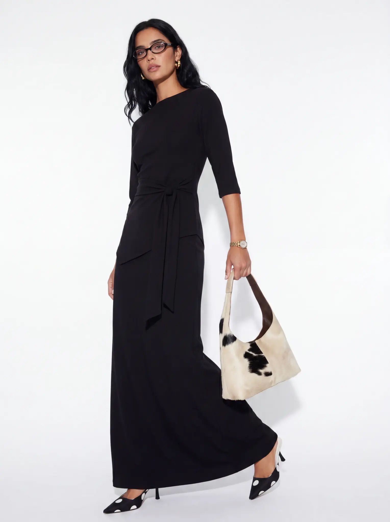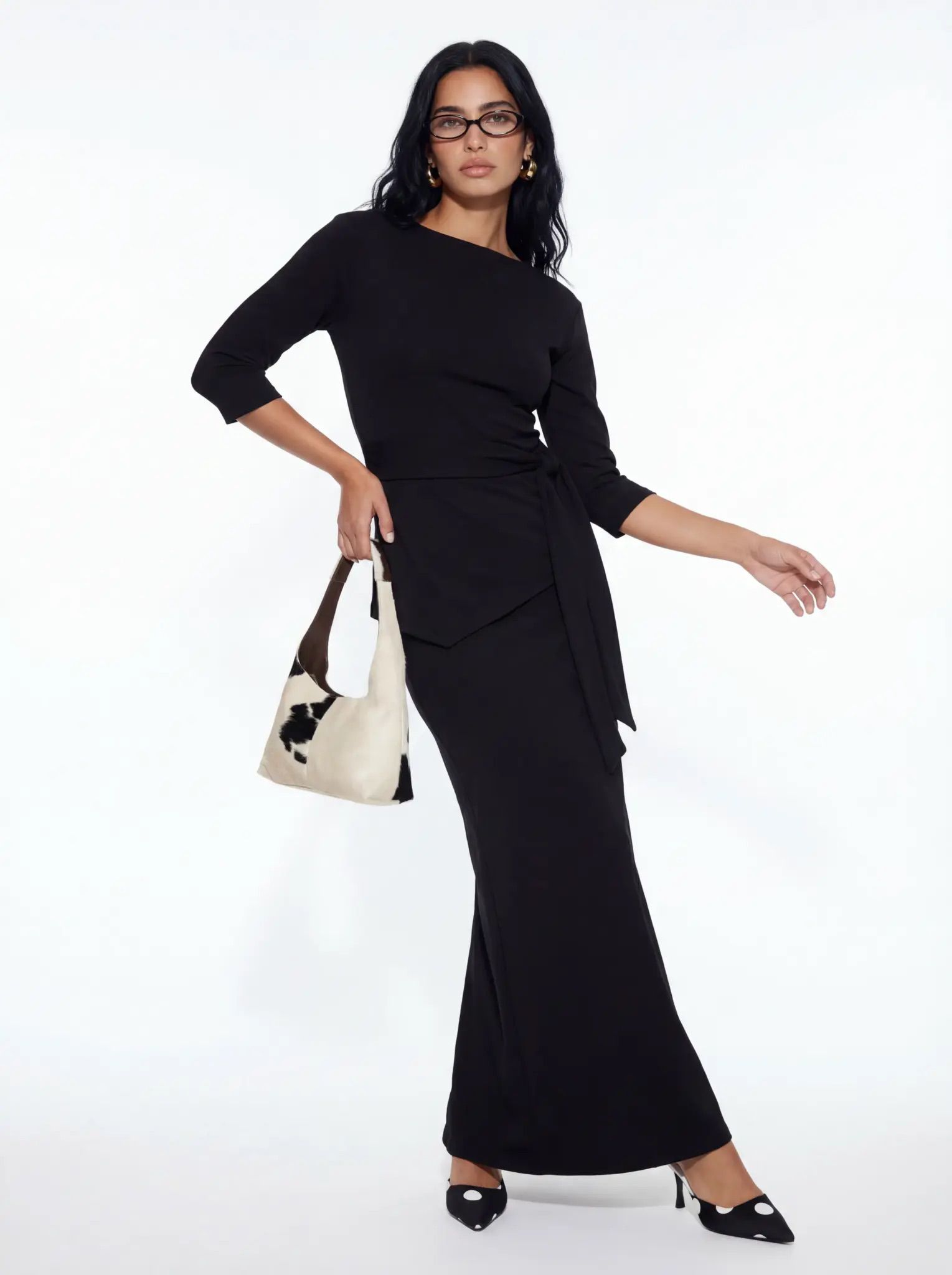 חליפת שני חלקים חולצה עם שרוולי 3/4 וחצאית מקסי תואמת, עם חגורת קשירה במותן למראה אלגנטי.