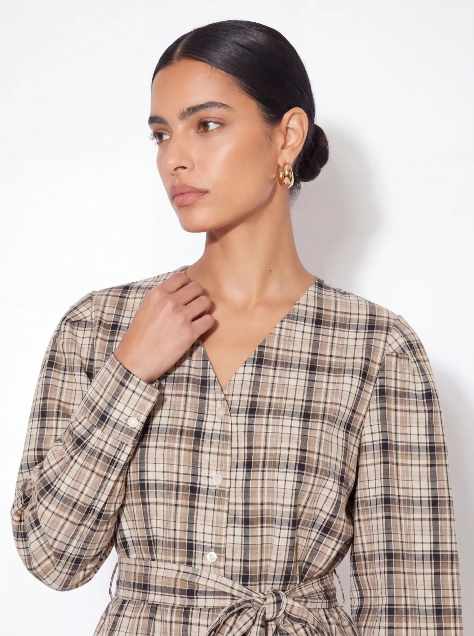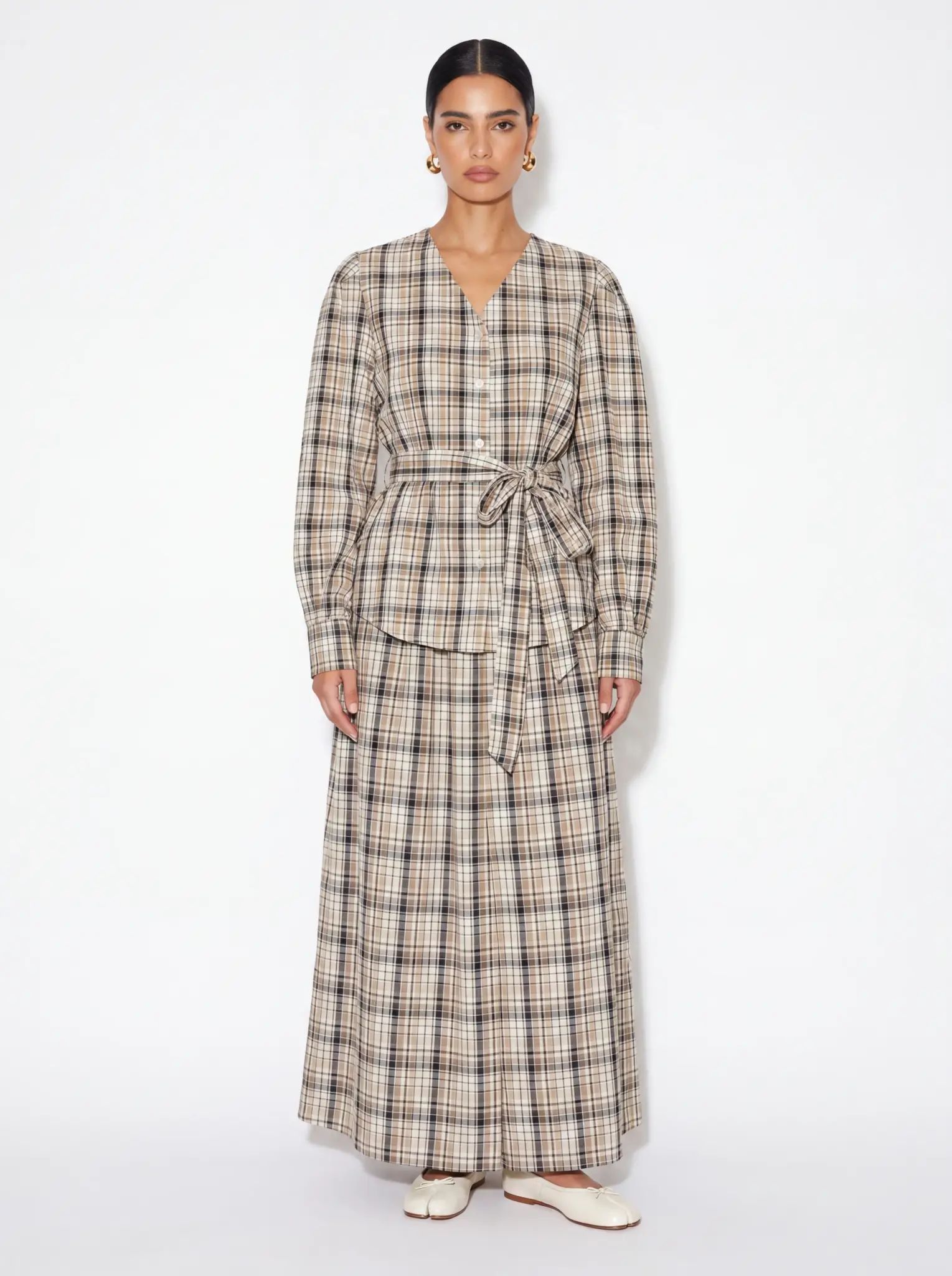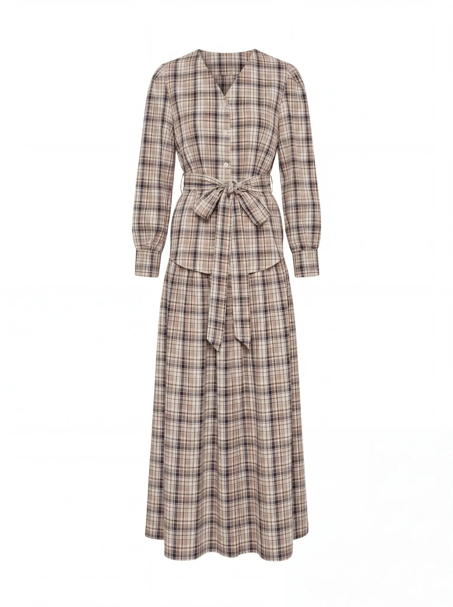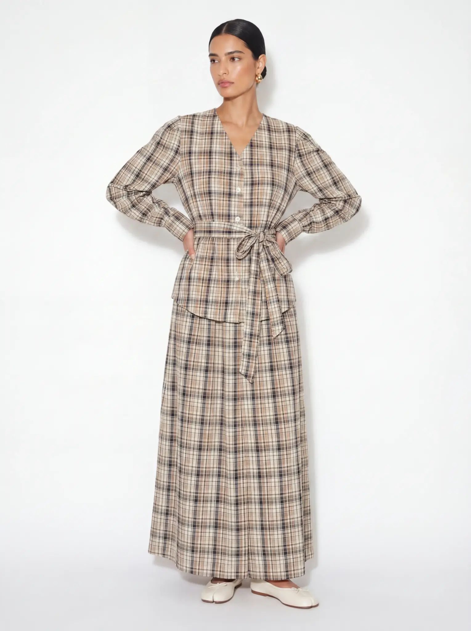 חליפת שני חלקים בטקסטורת משבצות חולצה מכופתרת עם שרוולים ארוכים וחגורת קשירה במותן, וחצאית מקסי תואמת בגזרה נשפכת. מידת הבגד על הדוגמנית XS.