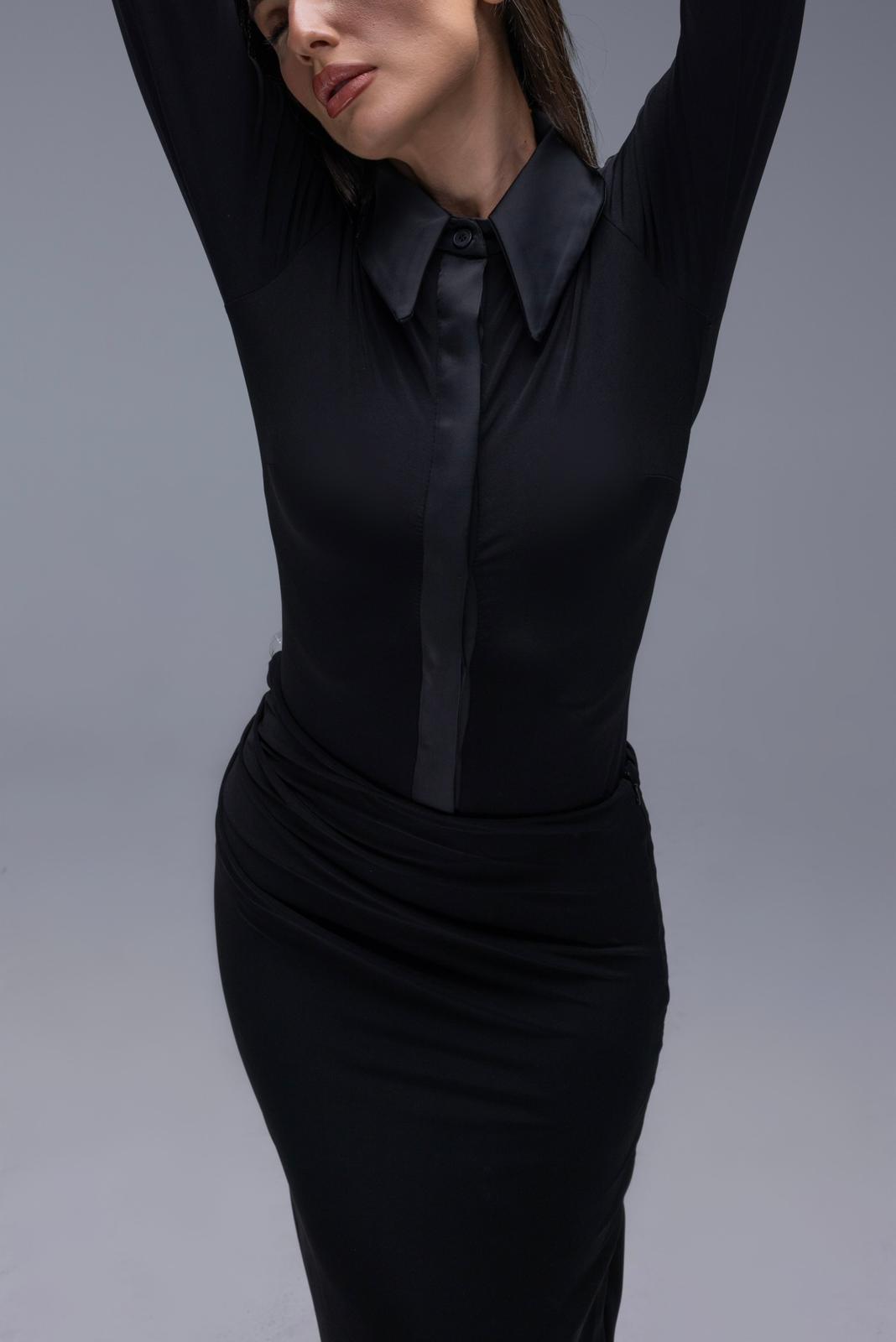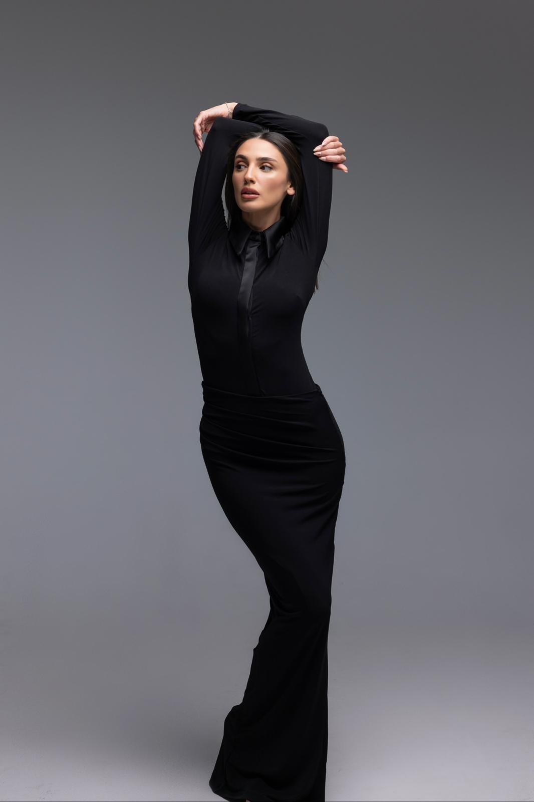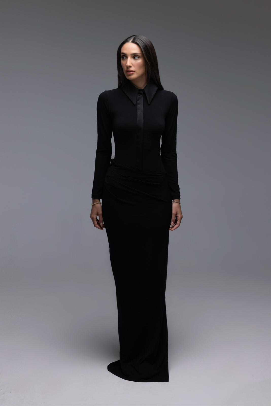 חליפה אלגנטית מבד לייקרה המשלבת בגד גוף עם צווארון וכפתורים נסתרים יחד עם חצאית מקסי מחטבת עם כיווצים במותן.