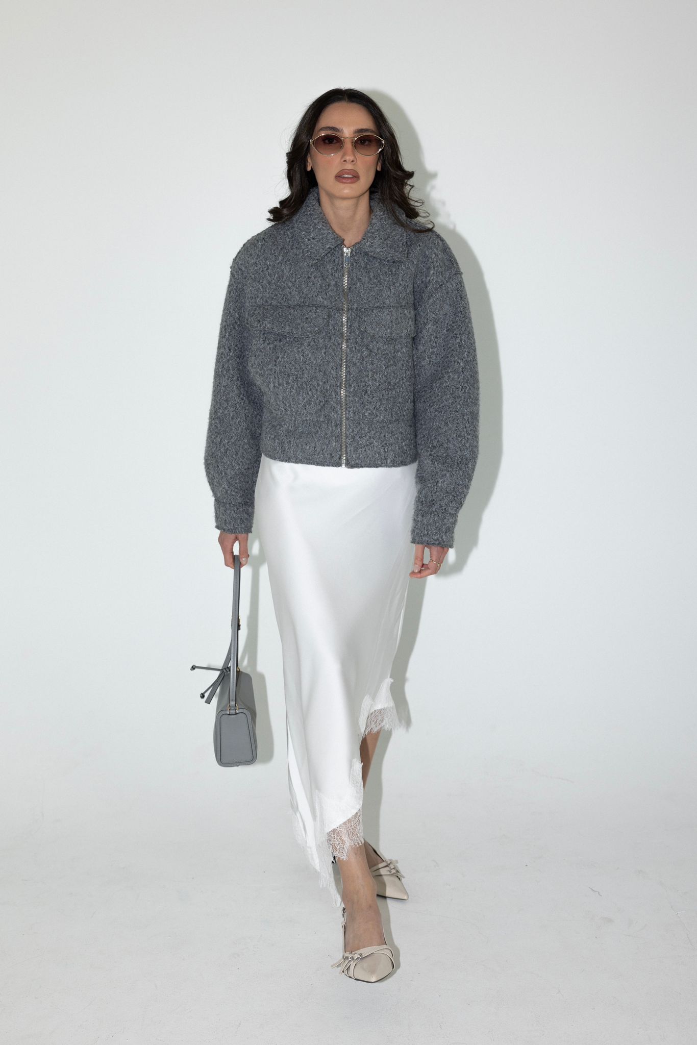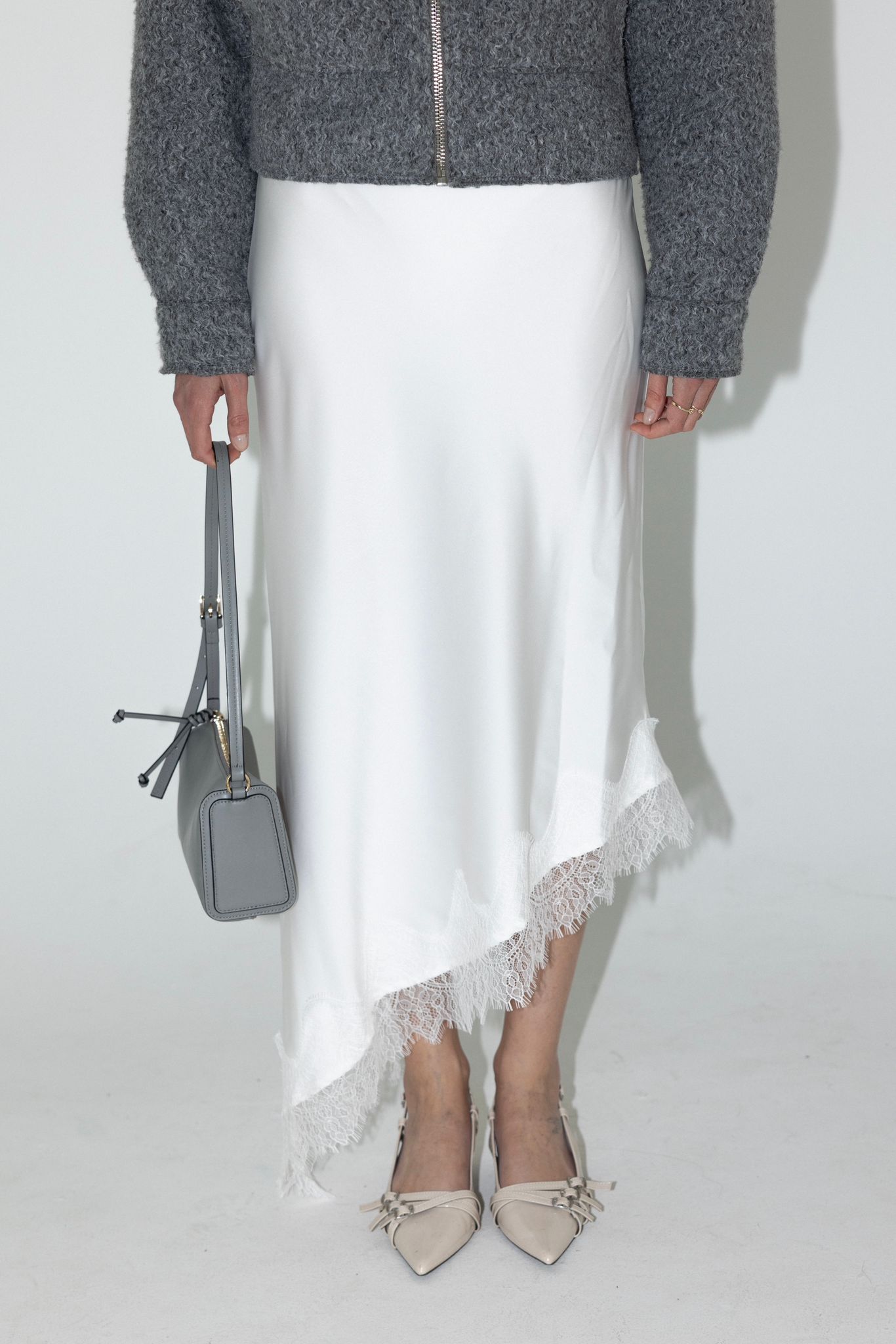 חצאית א-סימטרית אלכסונית מבד סאטן משי ותחרה בסיומת.