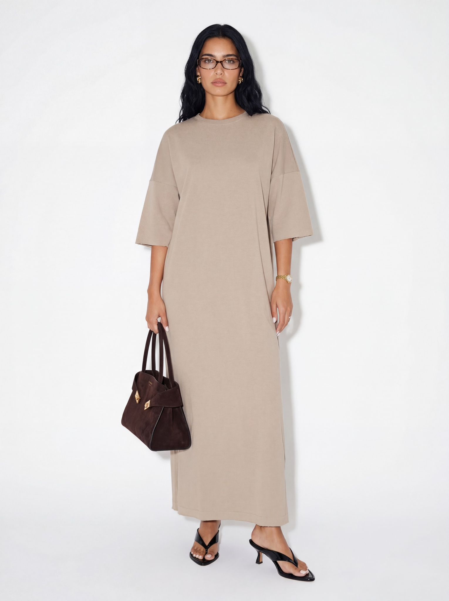 שמלה בגזרת אובר סייז, שרוול 3/4 ושתי שסעים בצידי השמלה.