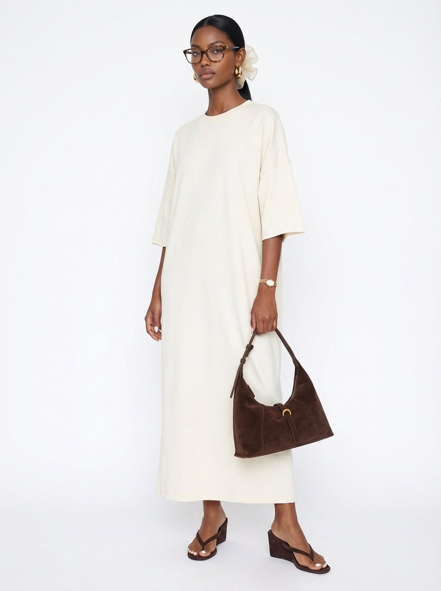 שמלה בגזרת אובר סייז, שרוול 3/4 ושתי שסעים בצידי השמלה. מידת הבגד על הדוגמנית XS