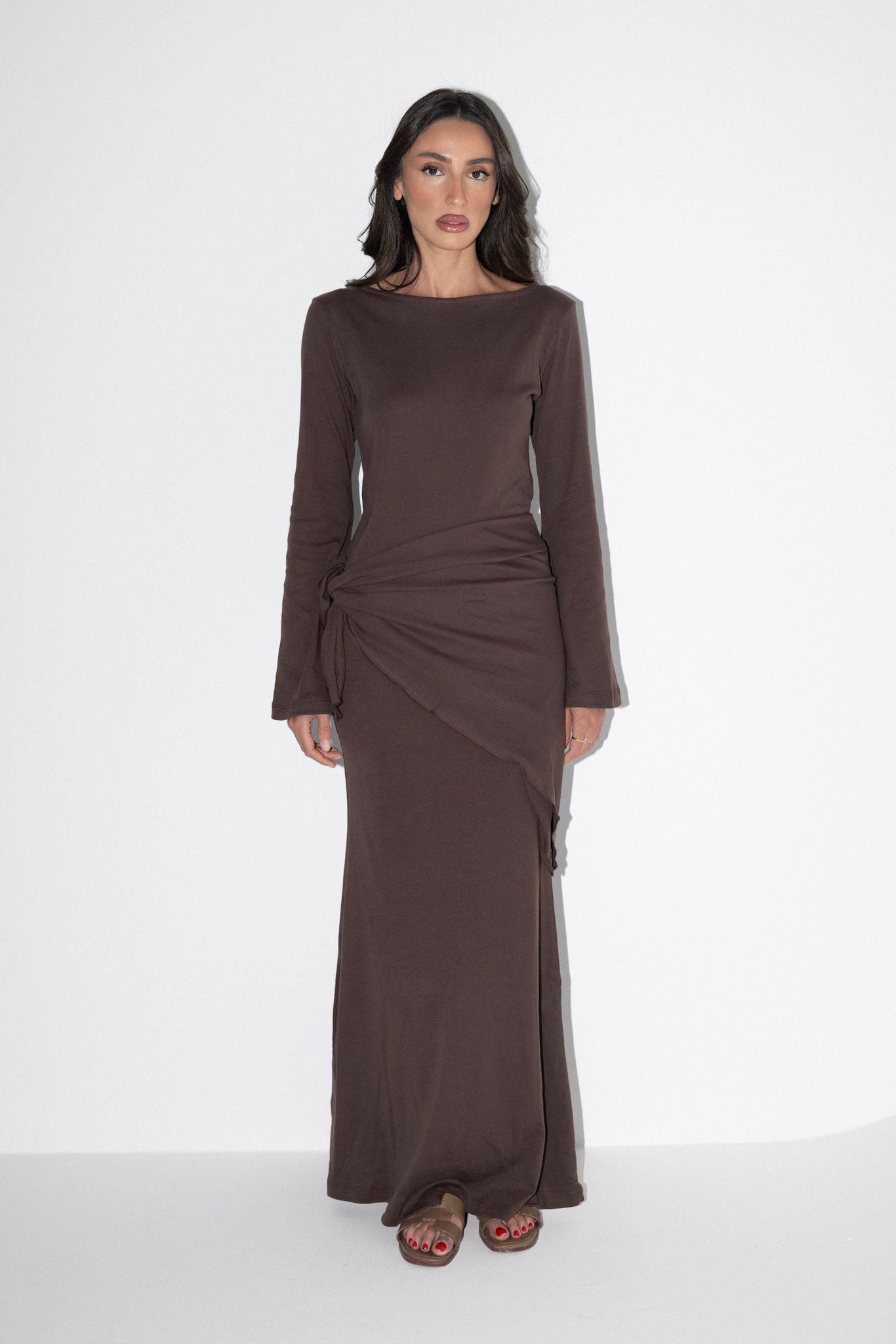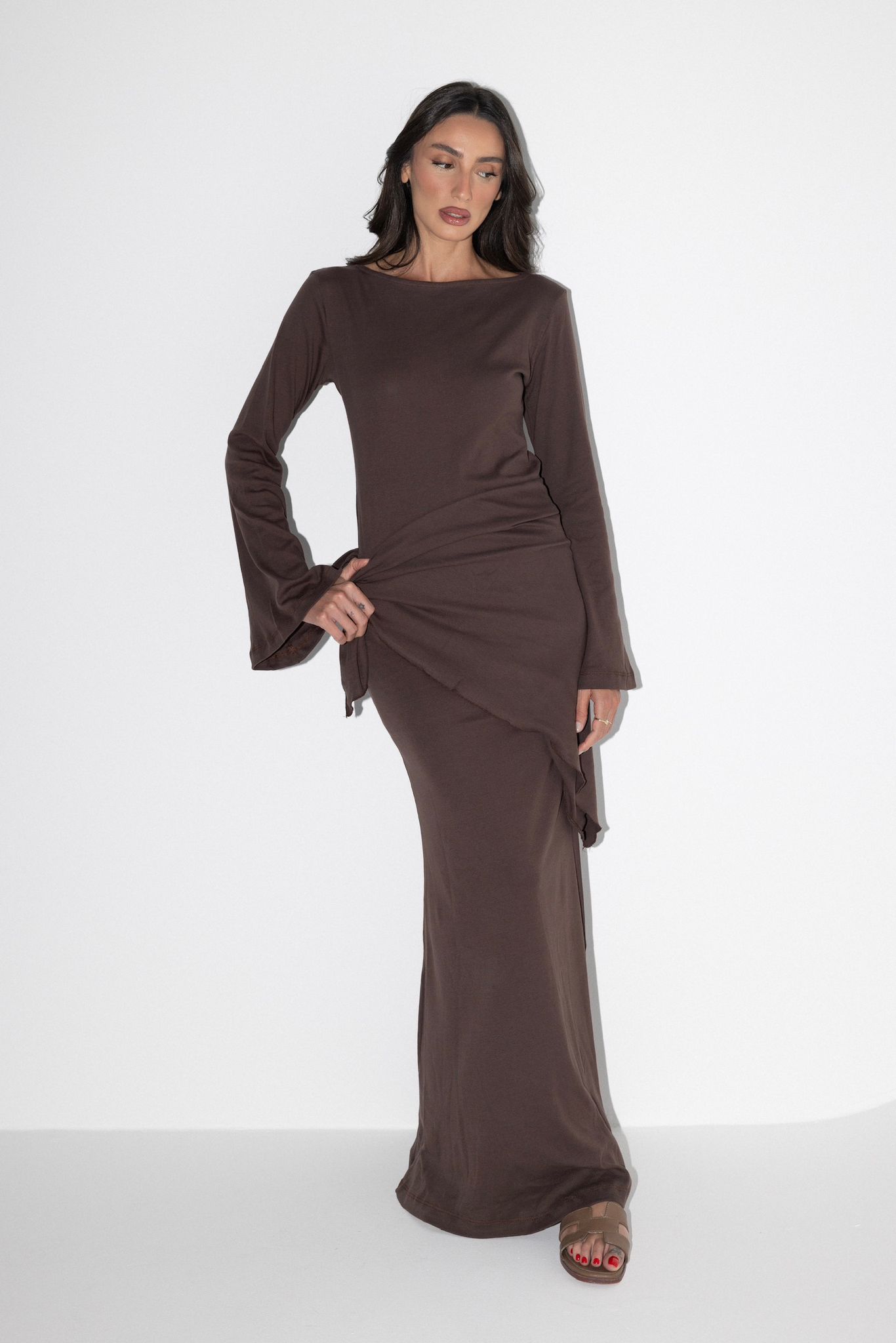 שמלת מקסי עם כיסוי ראש תואם גזרה צמודה ומחמיאה, שרוולים מתרחבים בטוויסט אלגנטי, וכיסוי ראש בגוון תואם להשלמת הלוק.